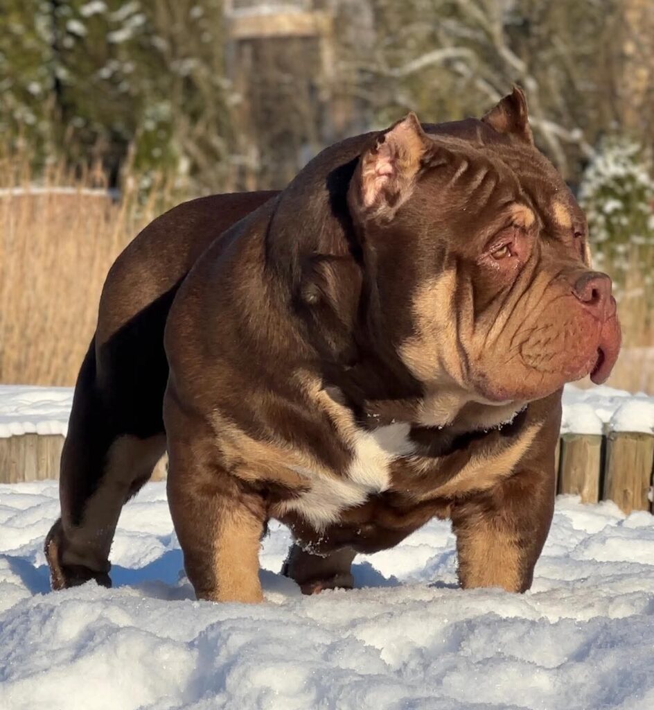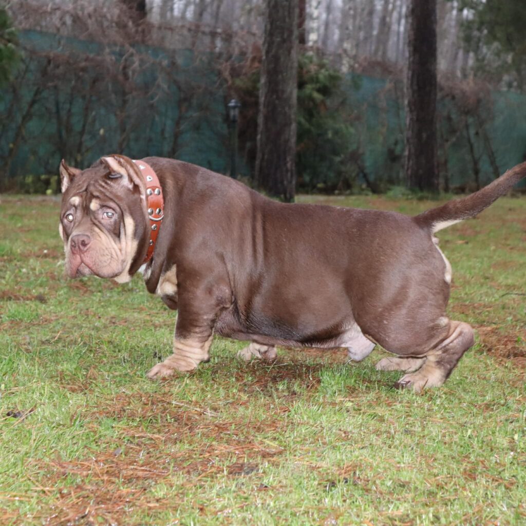 Marvel is also Ch.Grimm and Trapzilla grandson and Ursela linebreed. The ” wow factor “: the huge neck, the big bones and the muscle mass he carries all on a gorgeous chocolate tri suit can be used easily by people from Eastern Europe , Baltic countries, Rusia and Asia.